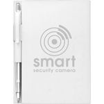 The 4.5" x 6" Baldwin Notebook is a paperback bound, recyclable notebook with 100 ruled pages and a paper pen loop integrated into the notebook spine. It also includes a matching color ballpoint pen. A pen imprint is not available.