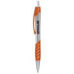 The Peyton Ballpoint Pen features a sleek, silver barrel with color accent grip and clip. Click action mechanism. Black ink cartridge.
