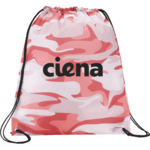 The Camo Oriole Drawstring Bag features an open main compartment that features different color camo prints and reinforced bottom corner tabs. The cinching rope closure keeps contents secure while carrying.
