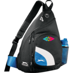 The Slazenger™ Sport Deluxe Sling Backpack features a zippered main compartment with a media pocket and an earbud port. There is also a front zippered pocket with an accessory pockets inside, as well as a side mesh water bottle pocket and an adjustable sling strap. Features signature Slazenger hardware and logo.